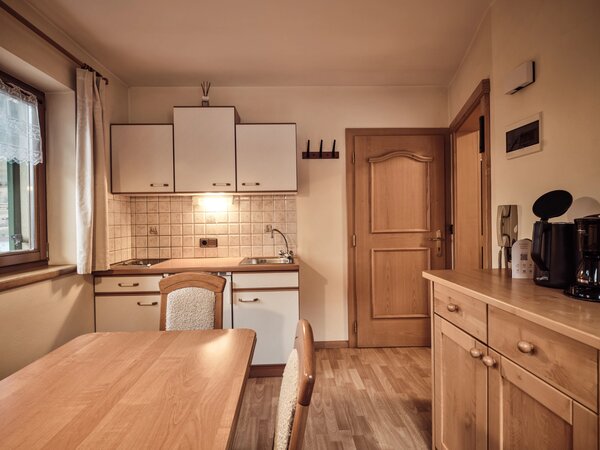 Eingerichtete Küche: Besteck, Tassen, Gläser, Teller, Töpfe, Kaffeemaschine, Kühlschrank, elektrische Herdplatte
